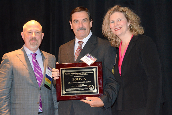 Ricardo Oddi in the place of Bolivia Chapter President, Renán Antelo, accepted plaque from Drs. Elijah Dixon and Rebecca Minter