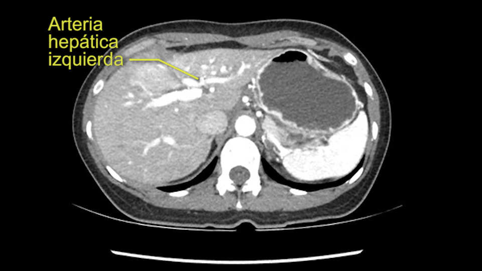 En cuanto a la técnica quirúrgica lo primero que hago es mirar al escáner a la fase arterial que tenemos aquí y claramente ese ve como los hepatocarcinomas son tumores muy vascularizados se pude como las ramas de la arteria hepática izquierda hay muchas ramas nutriendo a este tumor, parece que son bastantes grandes. Parece claro que todas las ramas yendo al hígado derecho están libres de tumor y yo no creo que haya ninguna invasión vascular en este caso. Y como se puede ver hay una gran masa que insisto parce que cuelga del segmento 3.