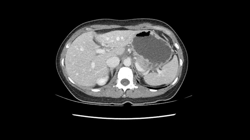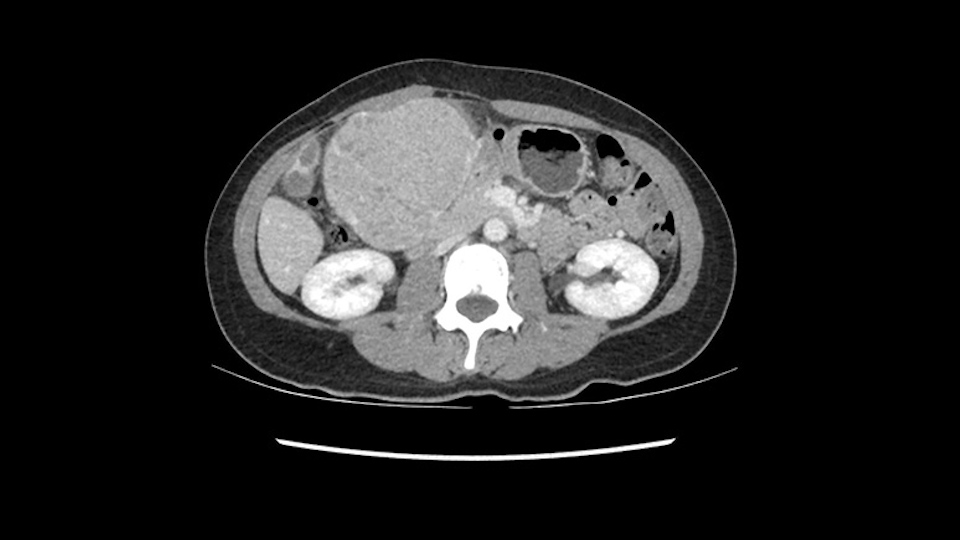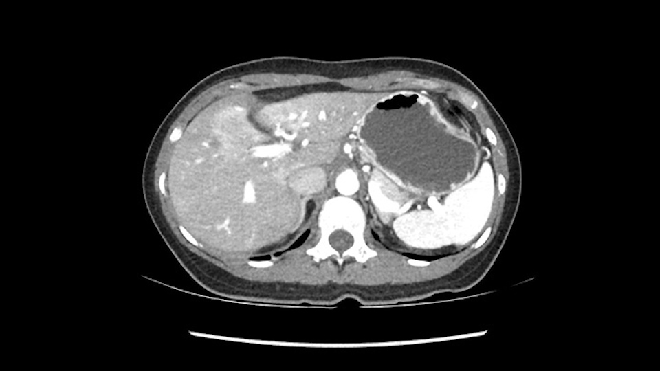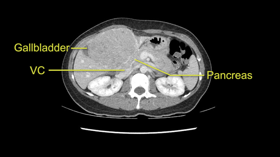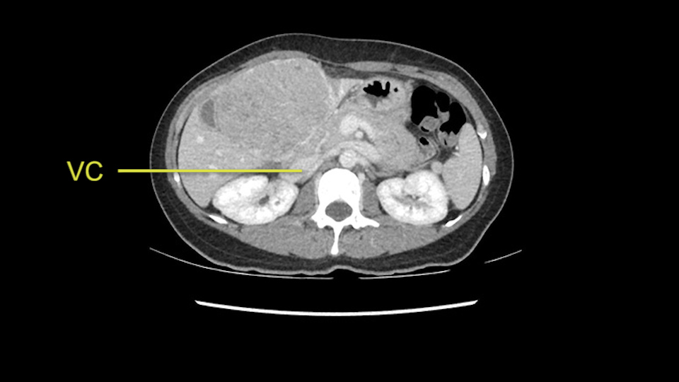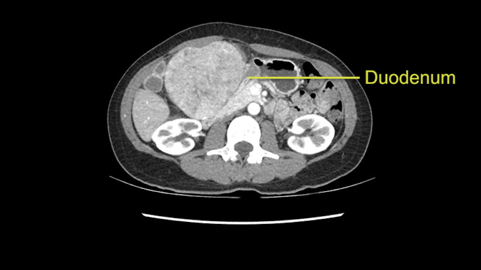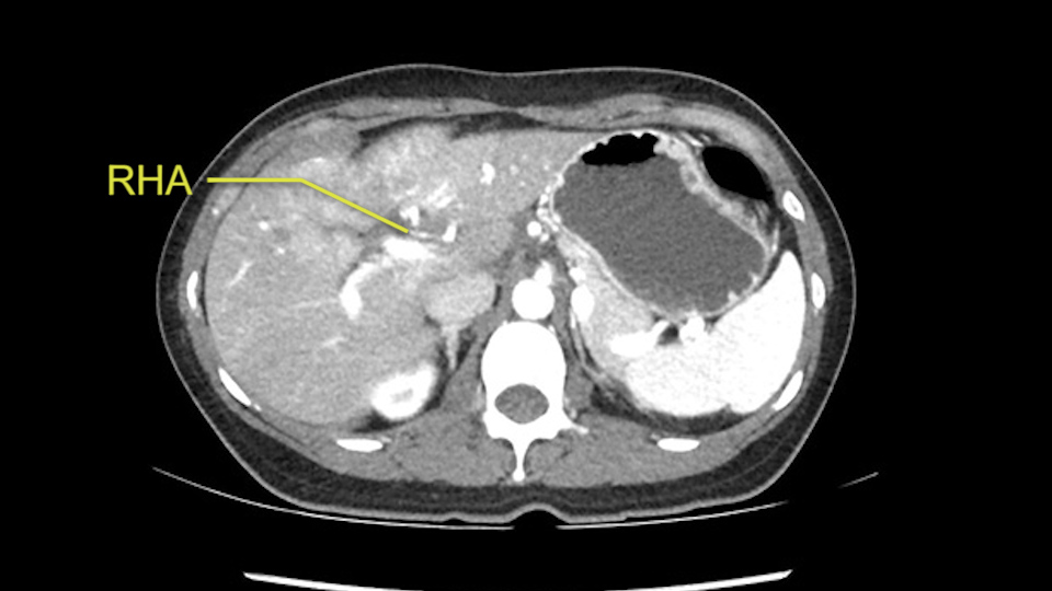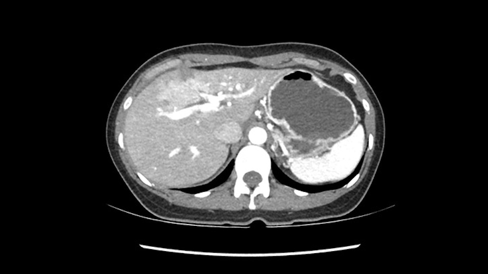 So in planning for this operation, as I look at the scans, I first visualize the arterial phase and I can see that there’s are a lot of big feeding arteries to this large tumor. Likely all the right side vessels feeding the right side of the liver: right hepatic artery and likely the Segment 4 artery are spared from the tumor. It’s likely the left hepatic artery is ramificating and giving feeding arteries to this tumor. It certainly looks like a large mass that its compressing other structures like the cava, the pancreas, the stomach; but I think there’s a plane and we can see that better in the venous phase. There’s a plane of separation between the gallbladder, the pancreas, the cava, that this tumor is abrupting but likely not invading. Usually, these masses actually don’t invade at that level and basically are pushing the tissues and once you open, you’re able to separate the tumor. Sometimes there’s some adhesions but you can actually separate and there’s usually no invasion.