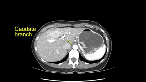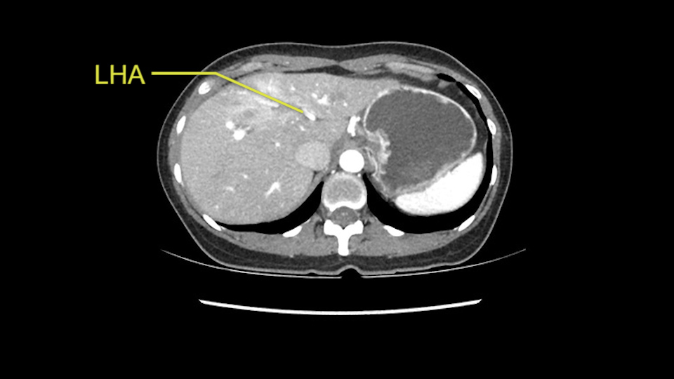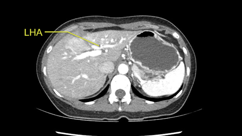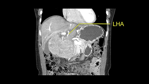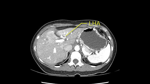The second is the left hepatic artery. The tumor is displacing the arterial system. So one of the important points which we need to see intraoperatively is to identify and preserve the right artery very carefully and identify the left hepatic artery for ligation.