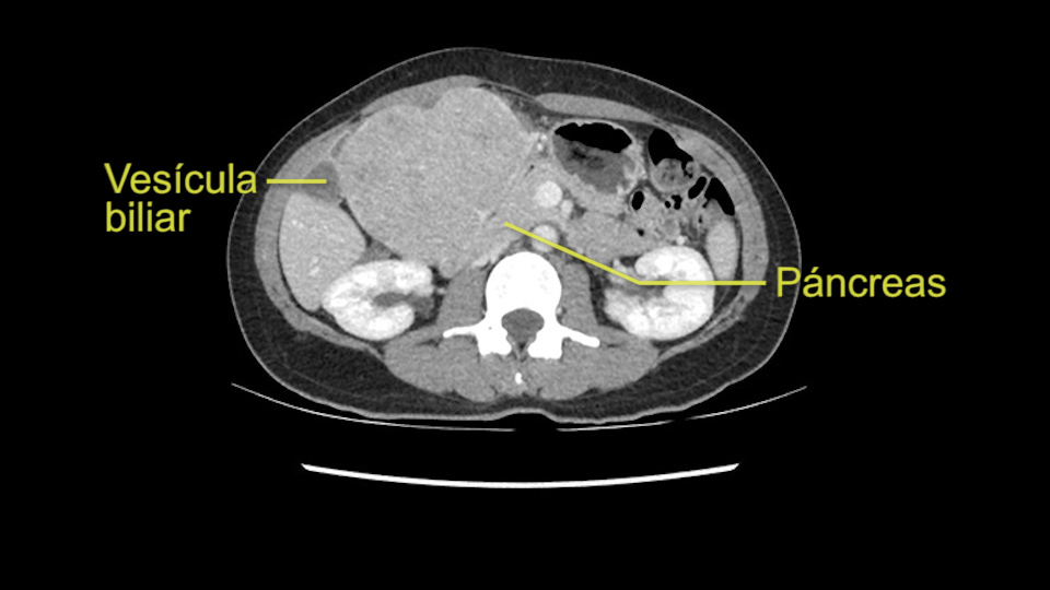 Lo siguiente que voy a hacer es mirar a la fase venosa. Y otra vez parece que todas las estructuras yendo al hígado derecho, es decir, tanto la vena porta derecha, la vena porta principal parece que están libres de tumor. Lo que si parce es que este tumor está comprimiendo diferentes estructuras, parece que comprime el páncreas, puede que este comprimiendo la cava, la vesícula biliar, pero en la mayoría de estos casos estos tumores no invaden estas estructuras, muy probablemente sea simplemente compresión, y una vez hallamos hecho la laparotomía es probable que todas estas estructuras queden separadas del tumor y puede que haya algunas adherencias que se puedan resecar sin problemas.