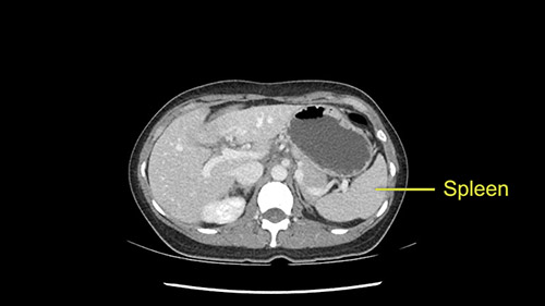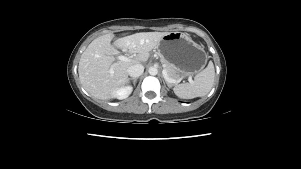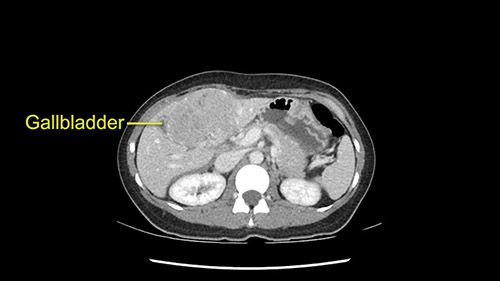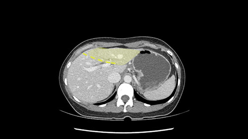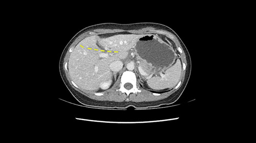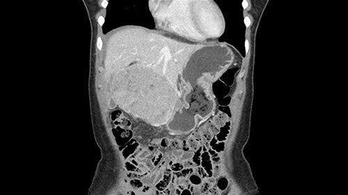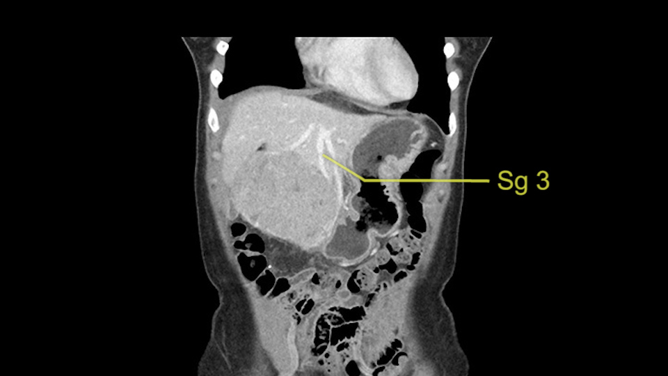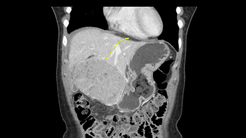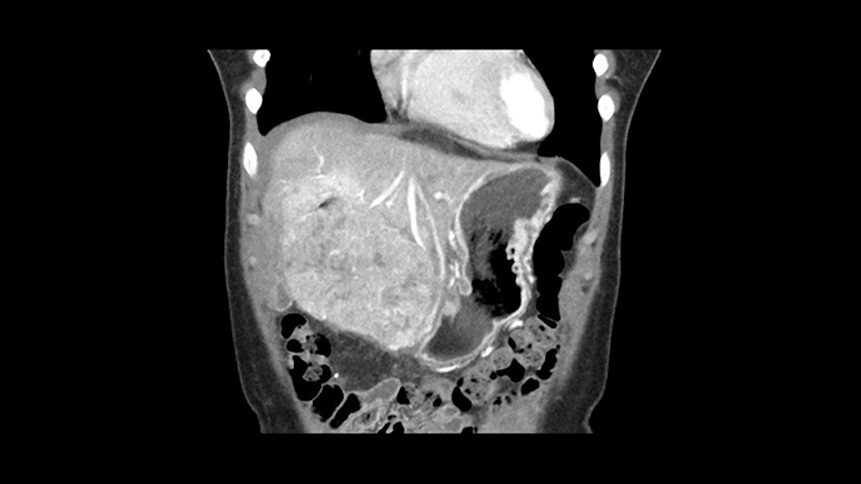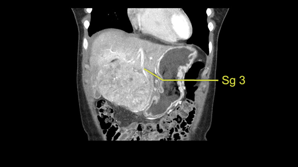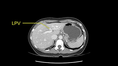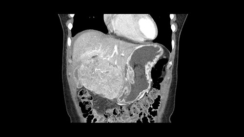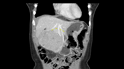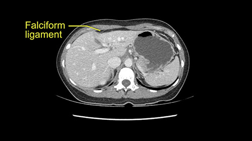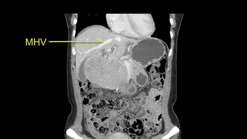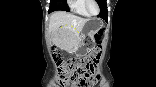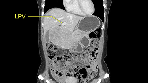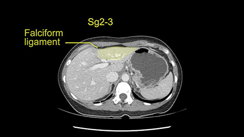 So if we look at the CT scan, on the axial, it’s a larger lesion. It’s about 6 or 7 or 8 centimeters. So it does look a bit threatening in terms of its resectability but if you really drill down deeply into the anatomy, and I think the coronal [imaging] is even better, you can see that the entire mass is on the patient’s left side of the falciform ligament. So it’s really only a left-sided tumor and not even really a left-sided tumor because Segment 4 is uninvolved anatomically.