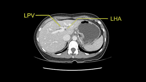 So I have to say that I would do this open, not laparoscopically because of the size of the tumor itself. Upper abdominal incision. Almost certainly, we’d be able to flip this very exophytic lesion up. Intraoperative ultrasound will show the relationship of the tumor and the left portal vein but the dissection at the base of the liver, as I look at things here, I can see the left hepatic artery which sneaks up to the left of the portal vein, should be out of harm’s way so I can take the Segment 2-3 left hepatic artery. The left portal vein is somewhat compressed. But by the time you pull the liver up a bit, you’ll be able to pull that left portal vein out to length and get a good margin on it.
