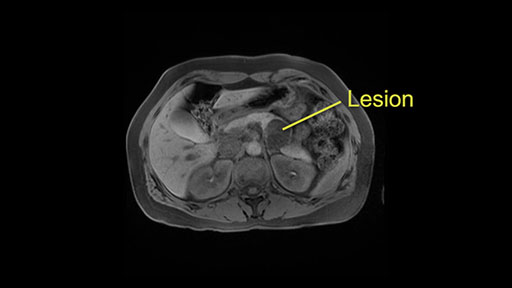 This is a 48-year old woman with history of kidney stones who was referred with an incidental finding of a lesion in the body of the pancreas. The multiseptated cystic lesion measures 3.2 x 3.9 x 4.3cm with an area of gadolinium-enhanced septal thickness. She was asymptomatic with no history of pancreatitis. There is no biliary dilatation and the spleen appeared normal. The plan is to do a laparoscopic distal pancreatectomy with possible splenectomy.