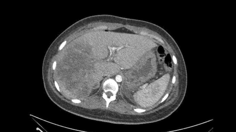 Imaging revealed a right liver infarction, right poral vein thrombosis extending to the main portal vein. Both the right and left hepatic arteries were absent but normal arterial flow was identified through an accessory branch off the left gastric artery. The consensus diagnosis is a vasculobiliary injury.